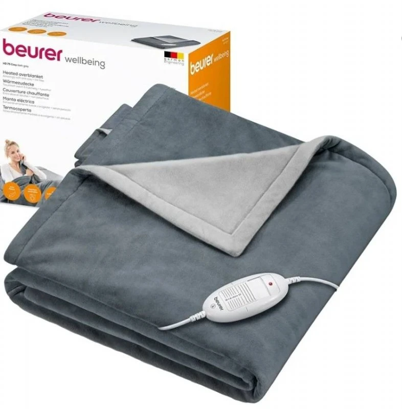 پتو الکتریکی گرما درمانی HD75 beurer پتویی از جنس اکرلیک دوستا پوست و بسیار نرم در ابعاد 130x180 سانتی متر است.(از مدل hd100 beurer کمی کوچکتر است) این مدل پتوی برقی بیورر جزء نمونههایی با سایز بزرگ است که قابلیت تنظیم در 6 دمای متفاوت را دارد و توان مصرفی آن 100 وات و بسیار کم مصرف و بهینه است.HD75 دارای سیستم ایمنی خاموش شدن خودکار BSS CONTROLER بوده که پس از 3 ساعت به طور خودکار گرما را قطع میکند. همچنین امکان کنترل میزان گرما یا همان BBS برای جلوگیری از گرم شدن بیش از حد پتو را نیز دارد.
